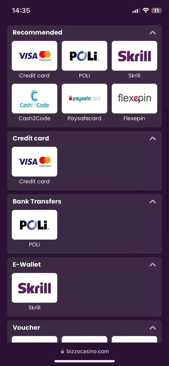 Payment Methods at Bizzo Casino NZ