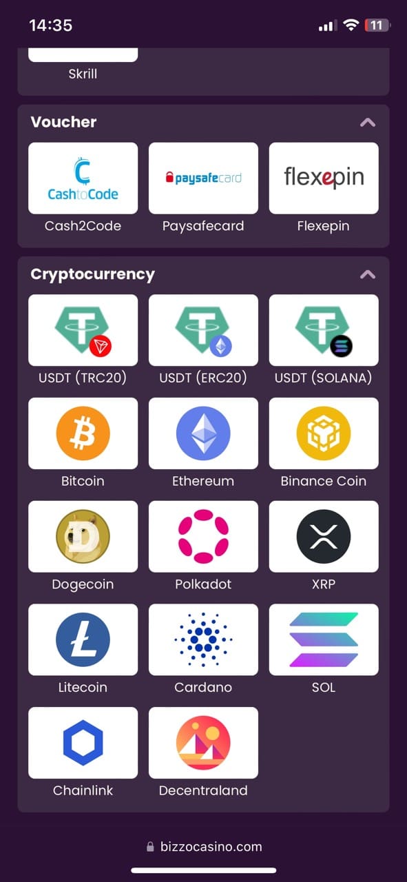 Bizzo Casino provides a long list of safe and reliable deposit and withdrawal methods for Kiwi players, focusing on crypto, which enables speedy and anonymous transactions. Please check the full list of options for NZ below: