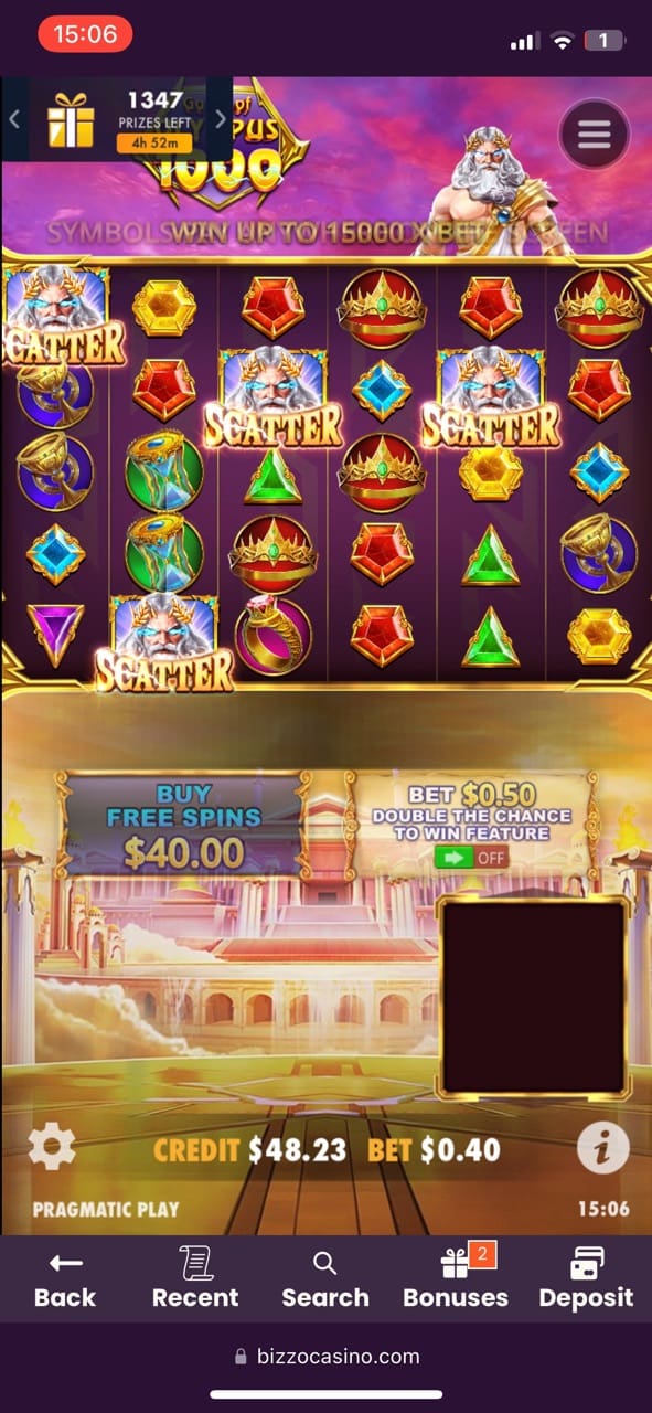 Describing my experience with Bizzo, I named quite a few games I personally played and managed to win real cash sums. Some of the top-rated titles at Bizzo are Games of Olympus 1000 with 98.3% RTP, Sugar Rush 1000 with 99.1% RTP, Alchemist with 98.4% RTP, Book of Ra Deluxe with 99.6% RTP, Chillies in Red with 97.7% RTP, Wolf Gold with 99.6% RTP and the list goes on. When previewing any pokie, you can see its RTP rate, the number of people currently playing the game and the provider’s name. This is quite handy. Note that you can play all pokies in demo mode without creating an account.