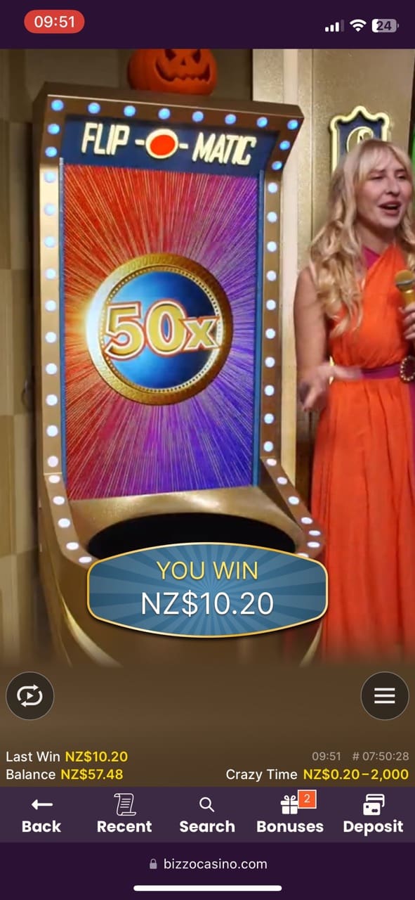 Among popular live dealer games in New Zealand, Bizzo offers Top Lobby, Live Casino Lobby, Gravity Roulette, Top Card, Lightning Storm, Crazy Time, Boom City, Funky Time, Aurora Blackjack Libra, One Blackjack, Dragon Tiger, and Caribbean Stud Poker, to name a few.