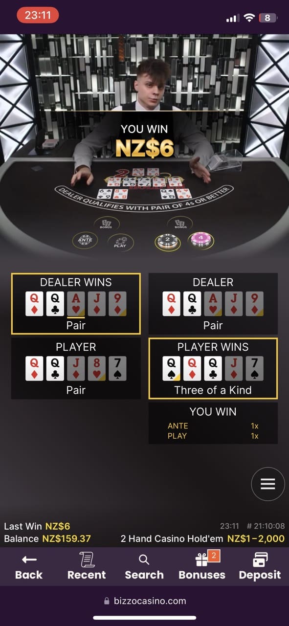Then, I played some live casino games like two variations of Hand Casino Hold’em, where I managed to win 12 NZD and 6 NZD and tried a few live game shows like Crazy Time with 10 NZD reward and Sweet Bonanza Candy Land with small winnings.