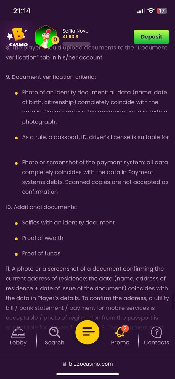 Regarding verification, Bizzo Casino may ask for proof of wealth, which was quite new to me as I didn’t see it at any other online casino in New Zealand. They can even request a video call to confirm your genuine intentions. Well, this may be beneficial for the safety but in my opinion, this is too much.