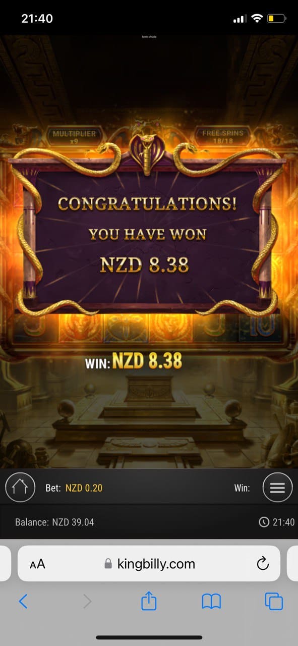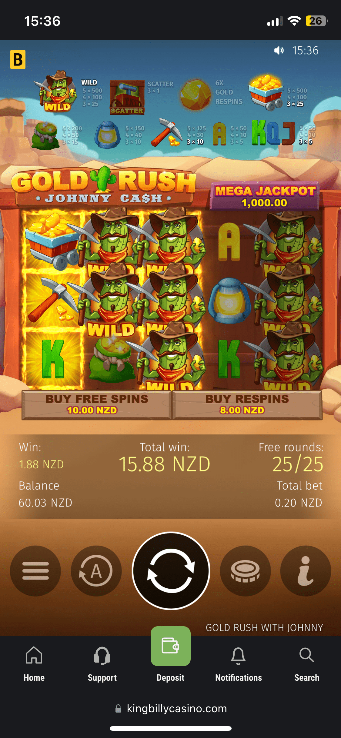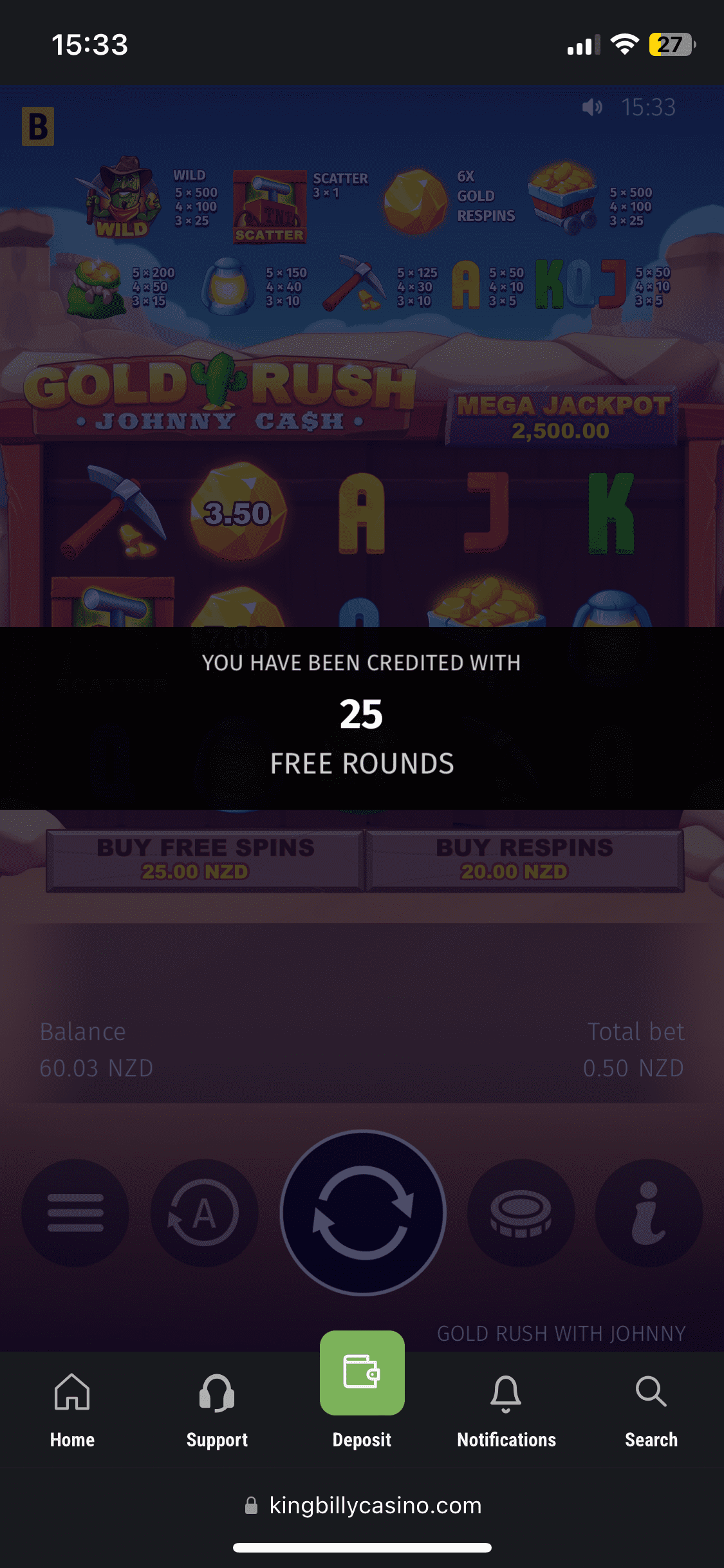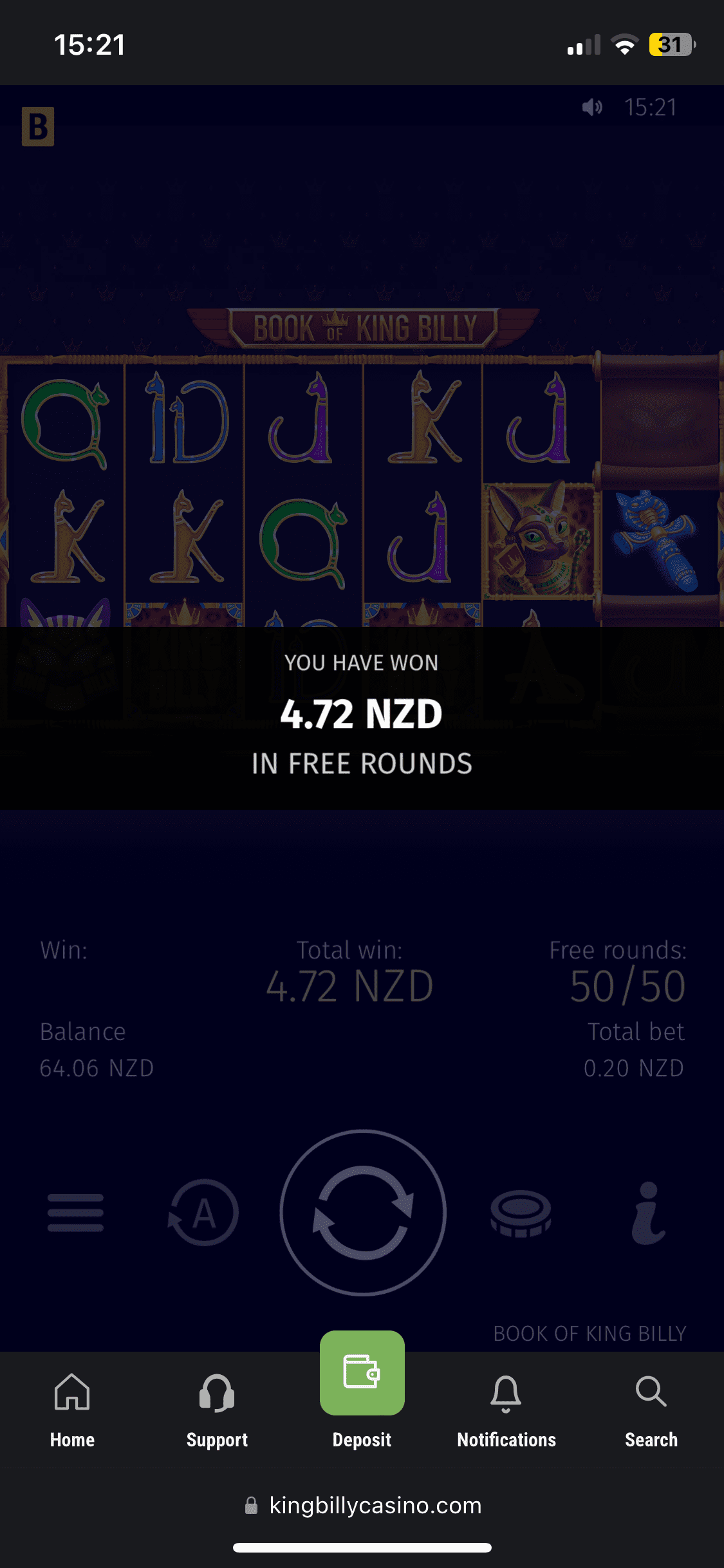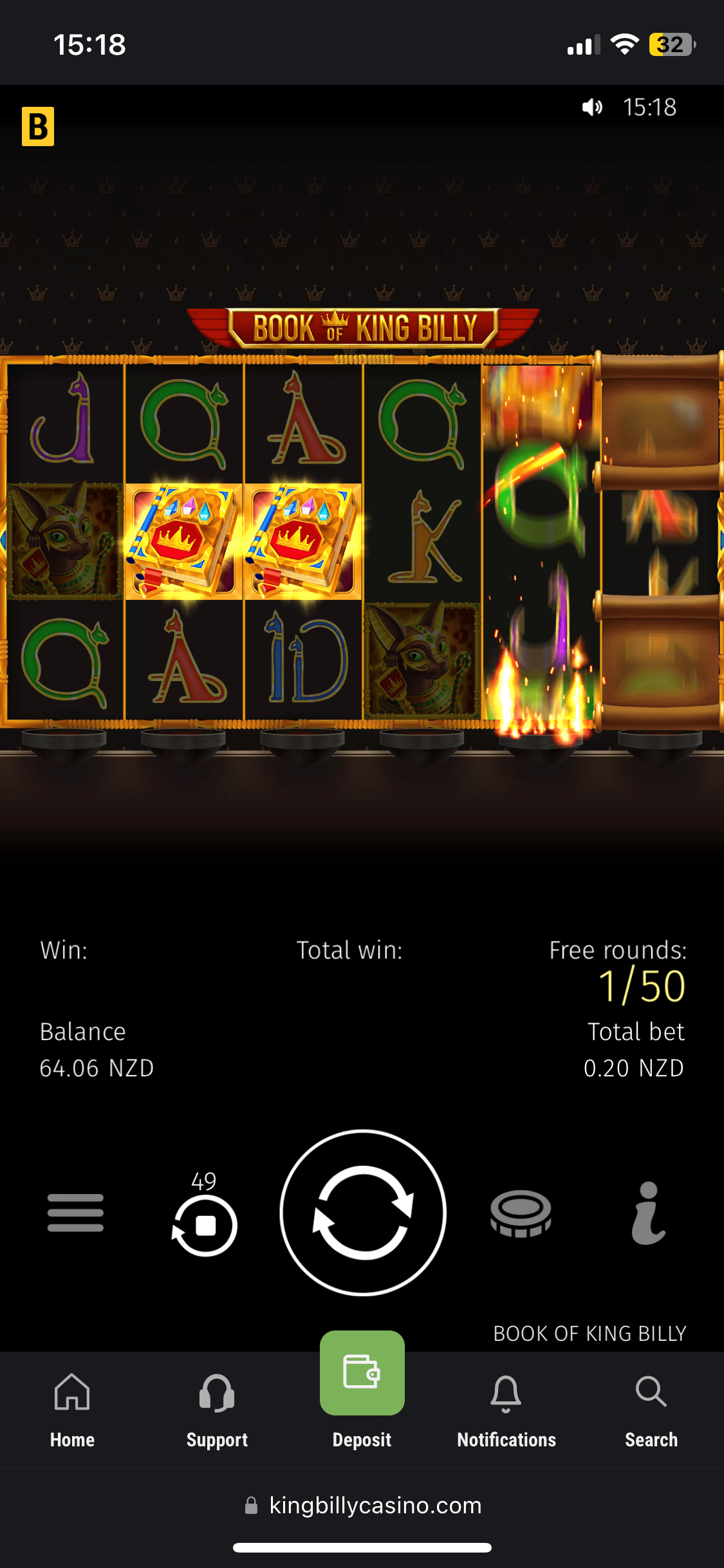 Ok, I deposited 30 NZD using Skrill, and they were added almost instantly with no fees. And it was time to claim the welcome bonus. I immediately got my balance doubled – 60 NZD and 50 free spins in Book of King Billy (The total amount of 100 Free Spins should be given in 2 packs of 50 Free Spins). The bonus comes with 30x wagering requirements and the max bet is 7.5 NZD. I managed to get 3.54 NZD in free rounds – not that rewarding. If you’re chasing extra value, check our casino bonuses for the latest NZ picks.