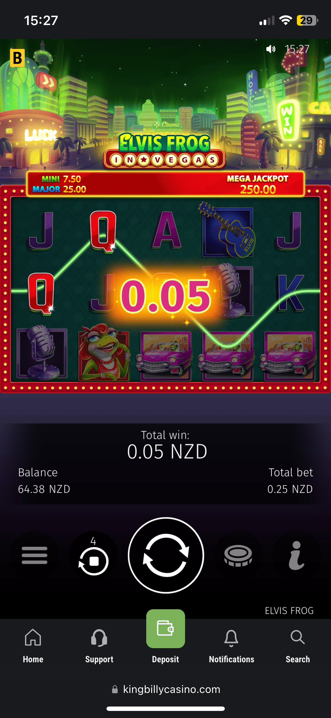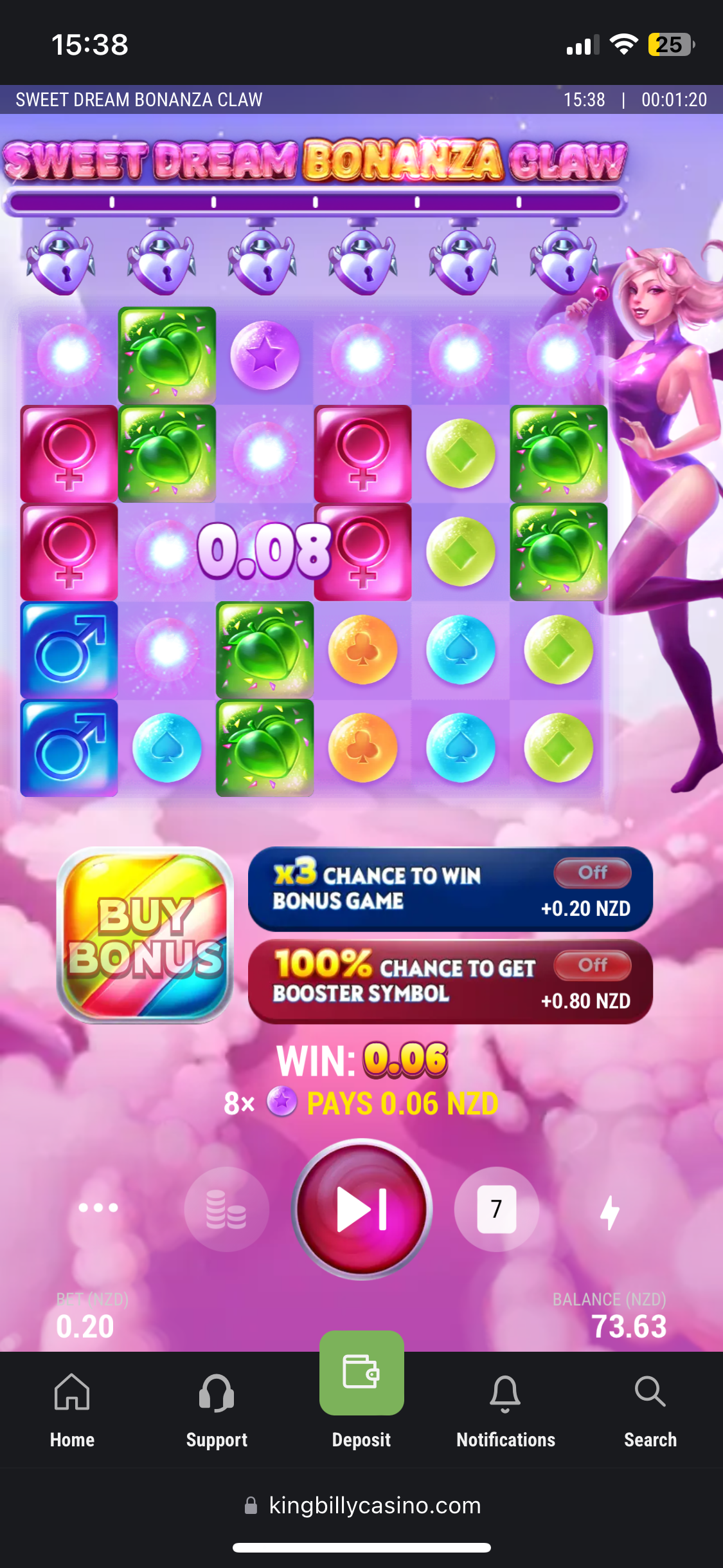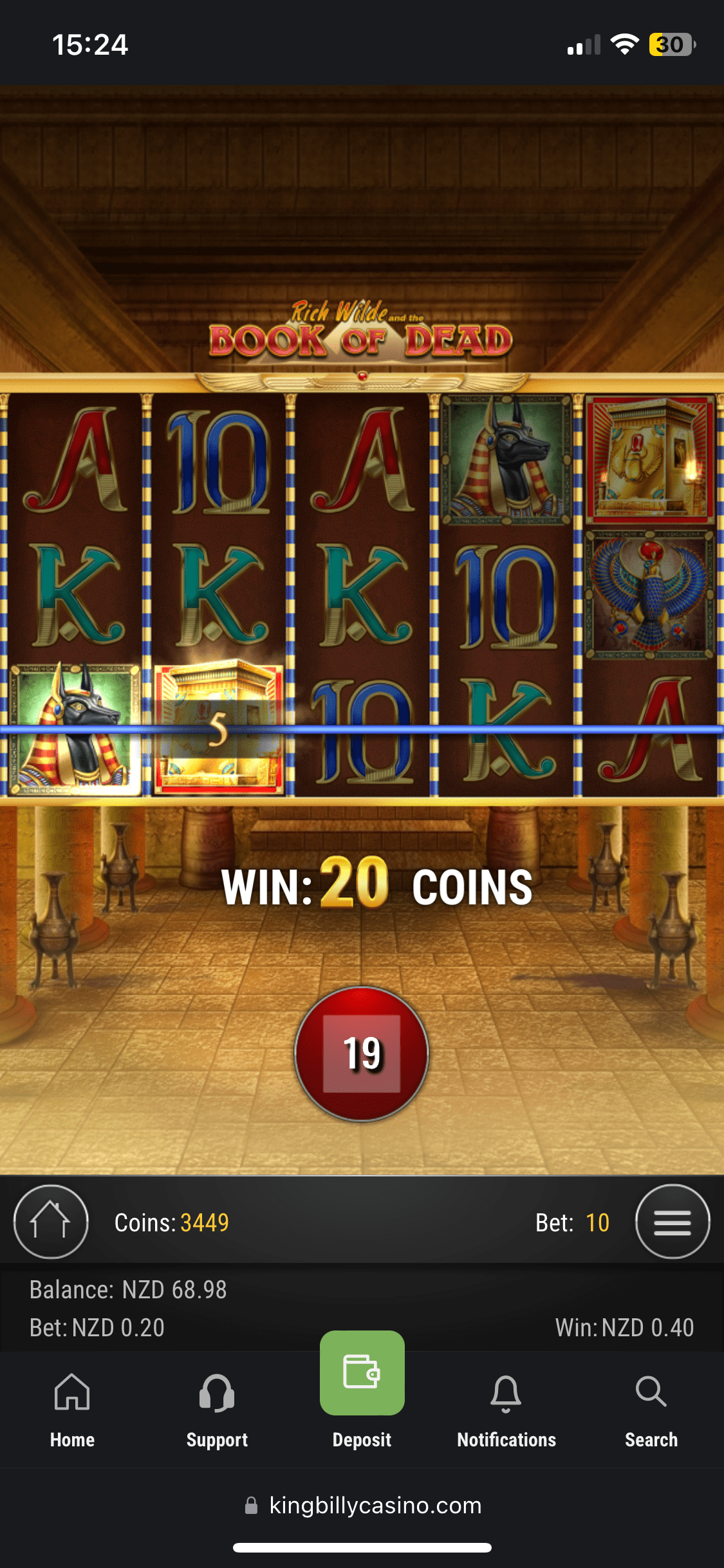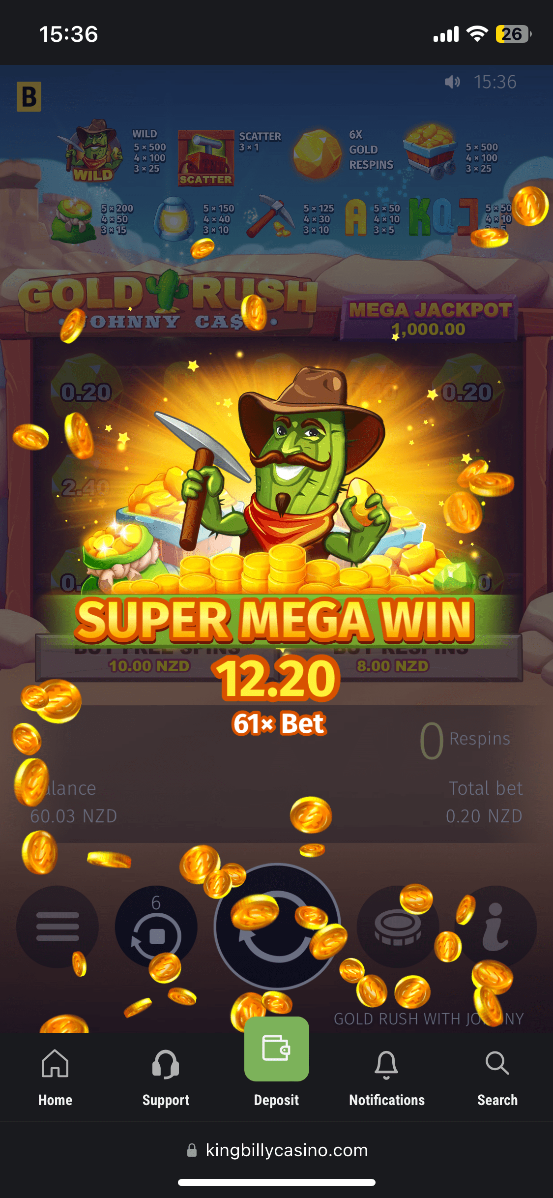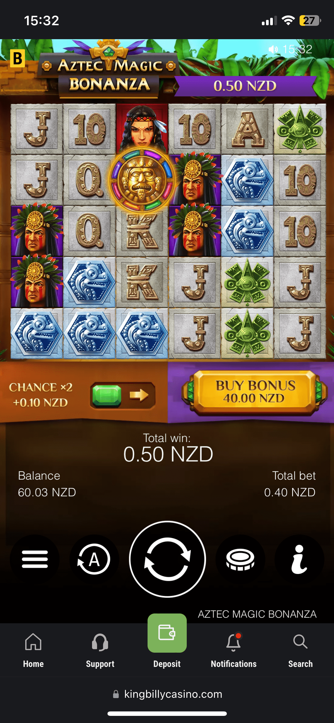 Ok, I deposited 30 NZD using Skrill, and they were added almost instantly with no fees. And it was time to claim the welcome bonus. I immediately got my balance doubled – 60 NZD and 50 free spins in Book of King Billy (The total amount of 100 Free Spins should be given in 2 packs of 50 Free Spins). The bonus comes with 30x wagering requirements and the max bet is 7.5 NZD. I managed to get 3.54 NZD in free rounds – not that rewarding. If you’re chasing extra value, check our casino bonuses for the latest NZ picks.