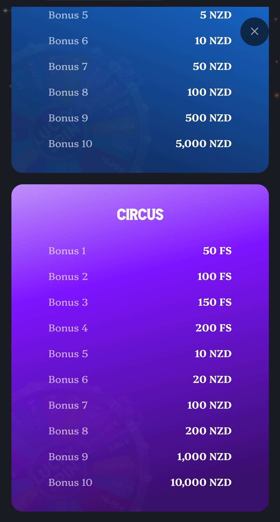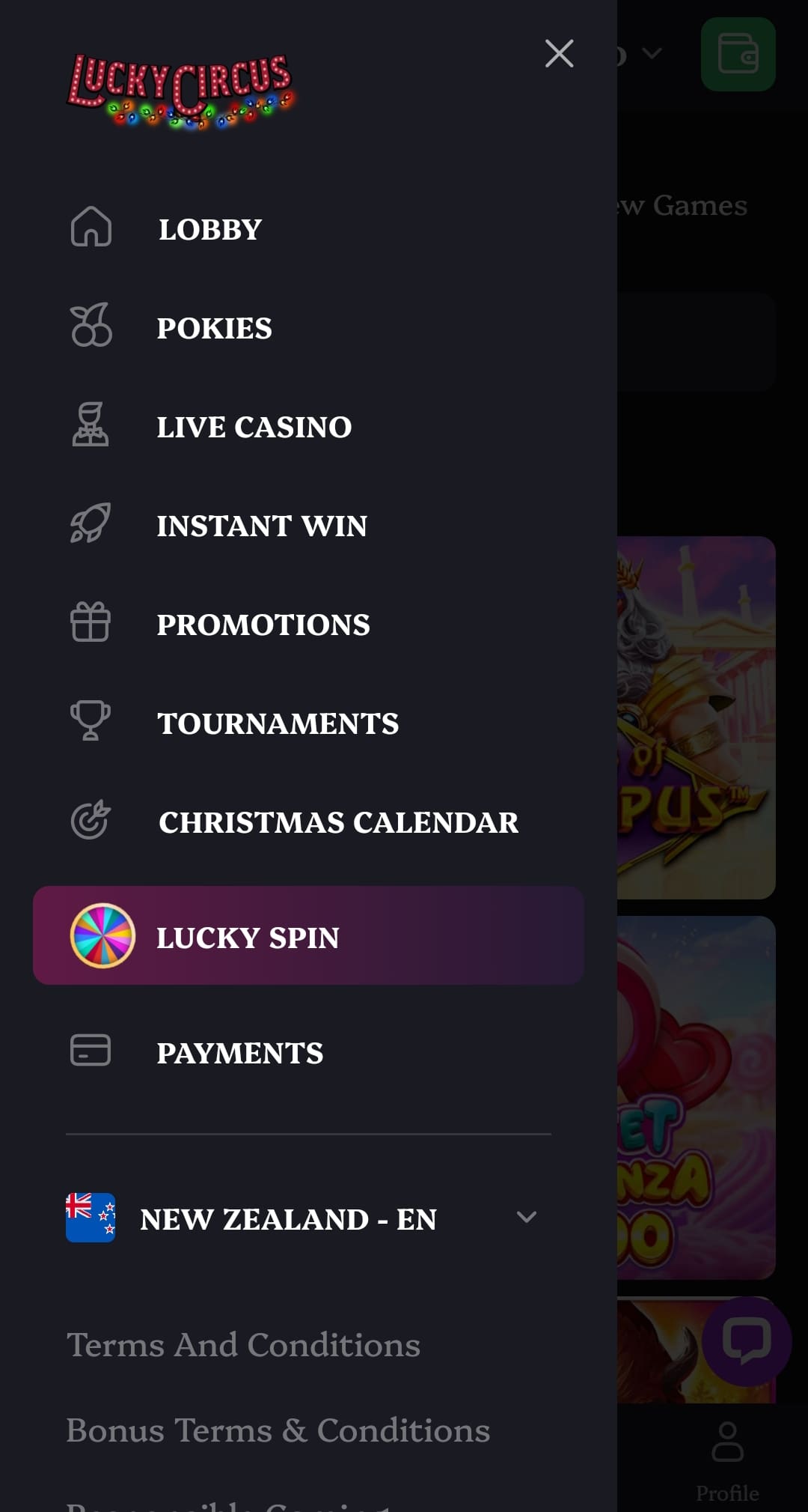 The unique thing about LuckyCircus is the Lucky Spin money wheel that you can spin whenever you make a deposit. A 30 NZD deposit grants you one spin on the Lucky Wheel, and a 100 NZD deposit grants you one spin on the Circus Wheel.