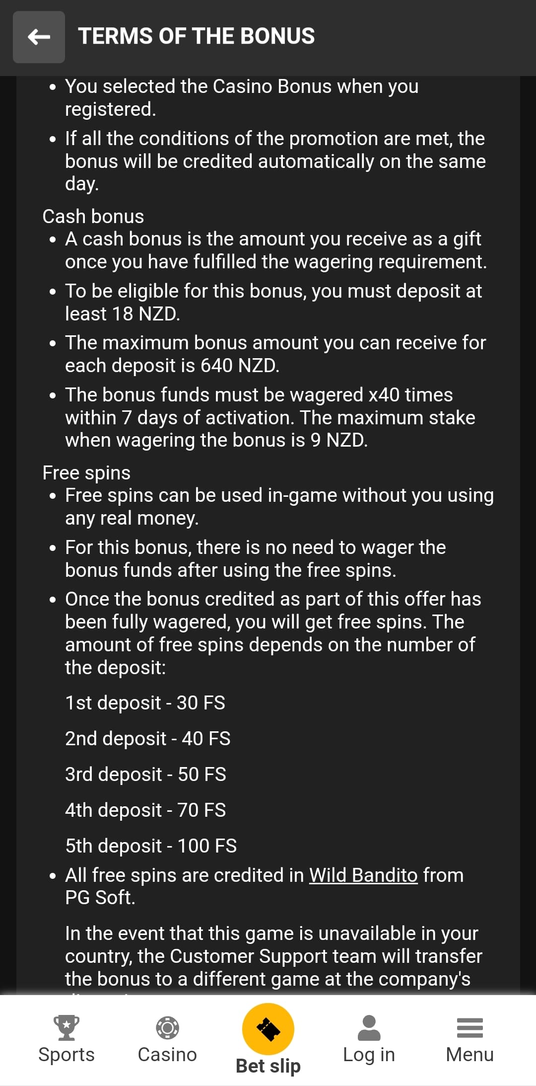 | Bonus | 200% up to NZ$1000 | 150% up to NZ$600 + 50 FS | 100% up to NZ$1000 + 200 FS | 100% up to NZ$1500 + 500 FS |
