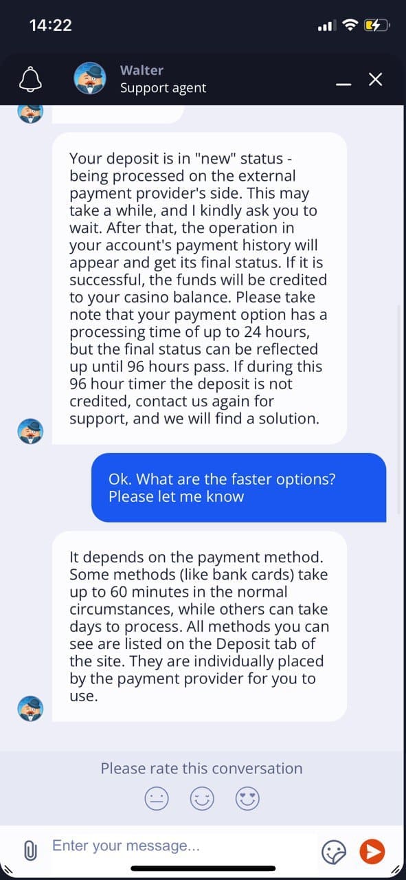 You can use their support email: [email protected]. For fast replies, customer support agents are online 24/7 – it’s an advantage. But they told me that they were working via the translator, which is not that good. On the other hand, when I asked about the delayed deposit (my fault since I entered the wrong sum), they offered me to wait up to 96 hours and redirected me to solve the issue with the payment provider. And it was the right decision to wait.