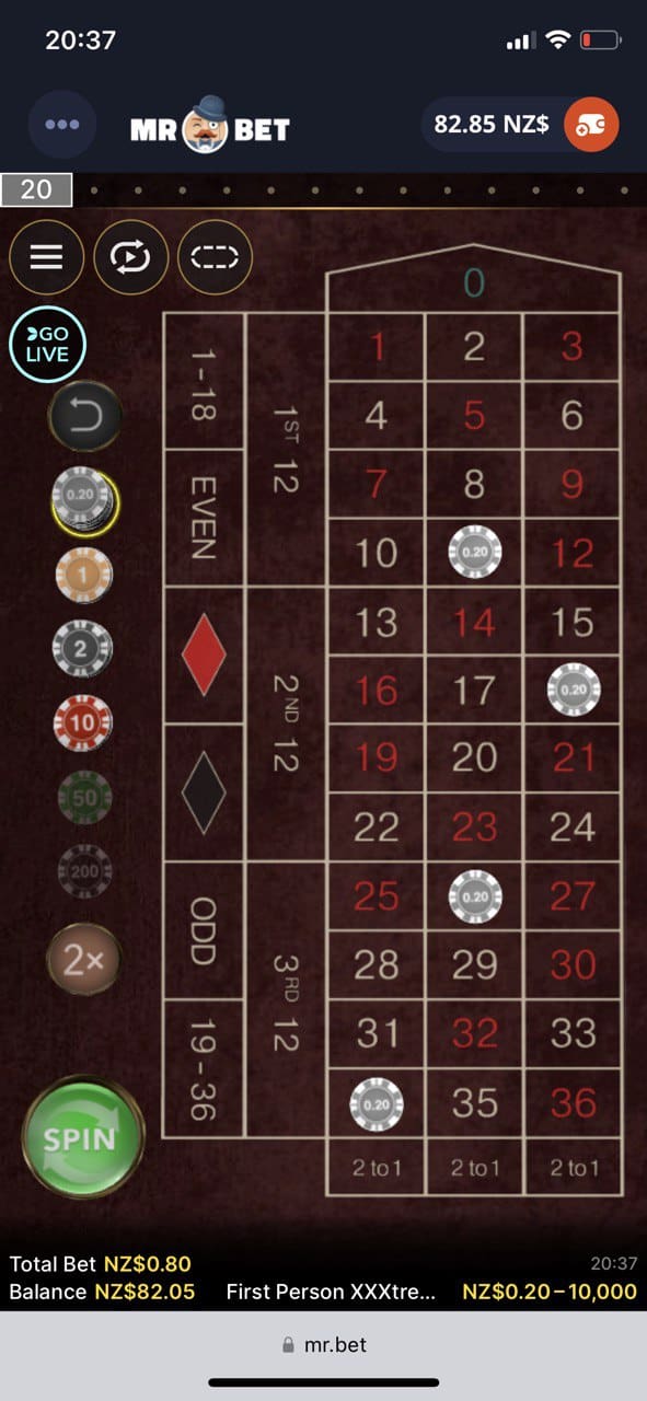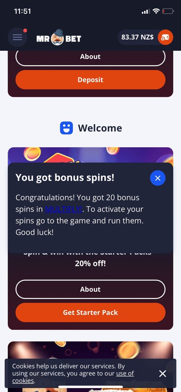 The Mr. Bet casino offers 80% bonus up to 270 NZD on a deposit of 36 NZD+. It comes with x40 wagering requirements. Besides, I was offered a Happy Hours Bonus that comes with 88% on the deposit and 88 free spins.