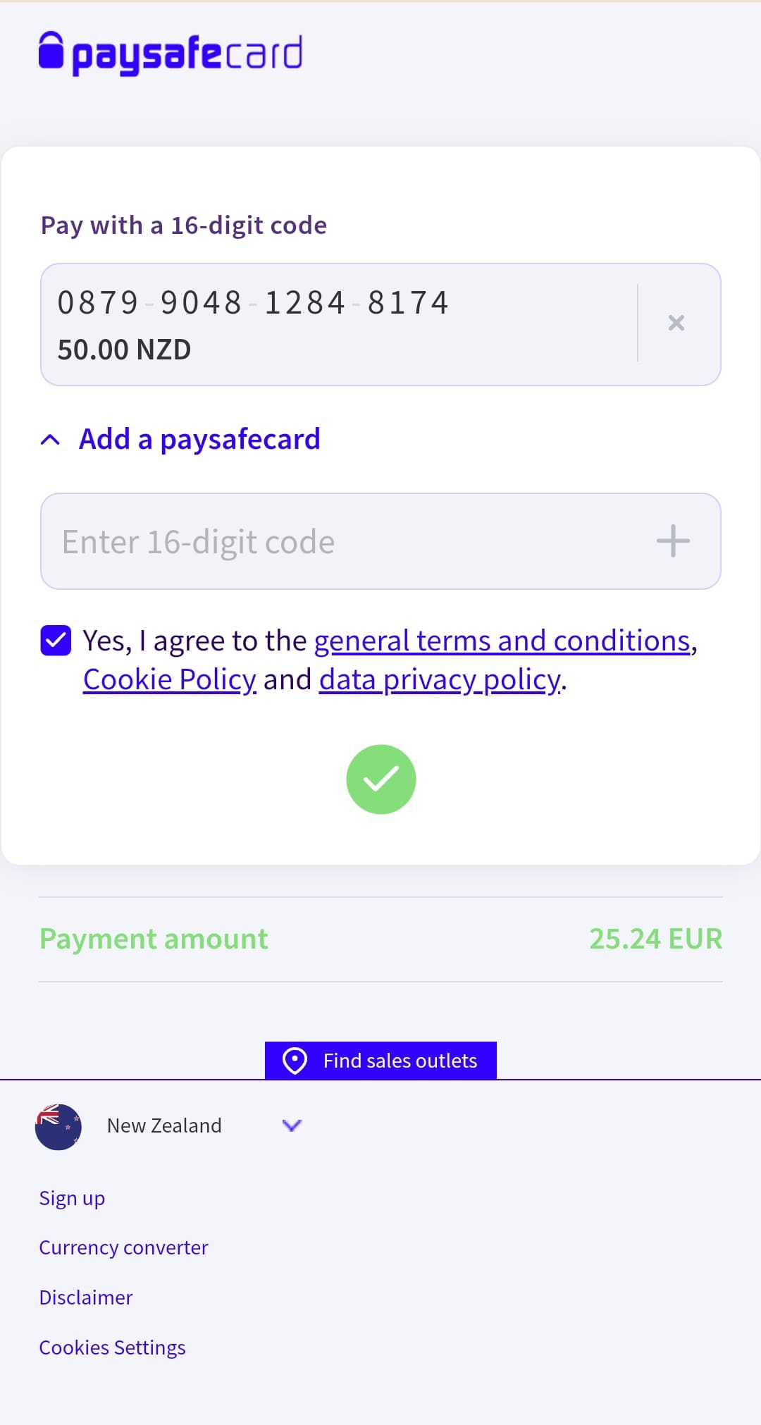 I used Paysafecard to deposit money this time around, and wanted to deposit NZ$50. Eventually I had to settle for deducting 25.04 EUR from my voucher, though that left a few cents on the table.