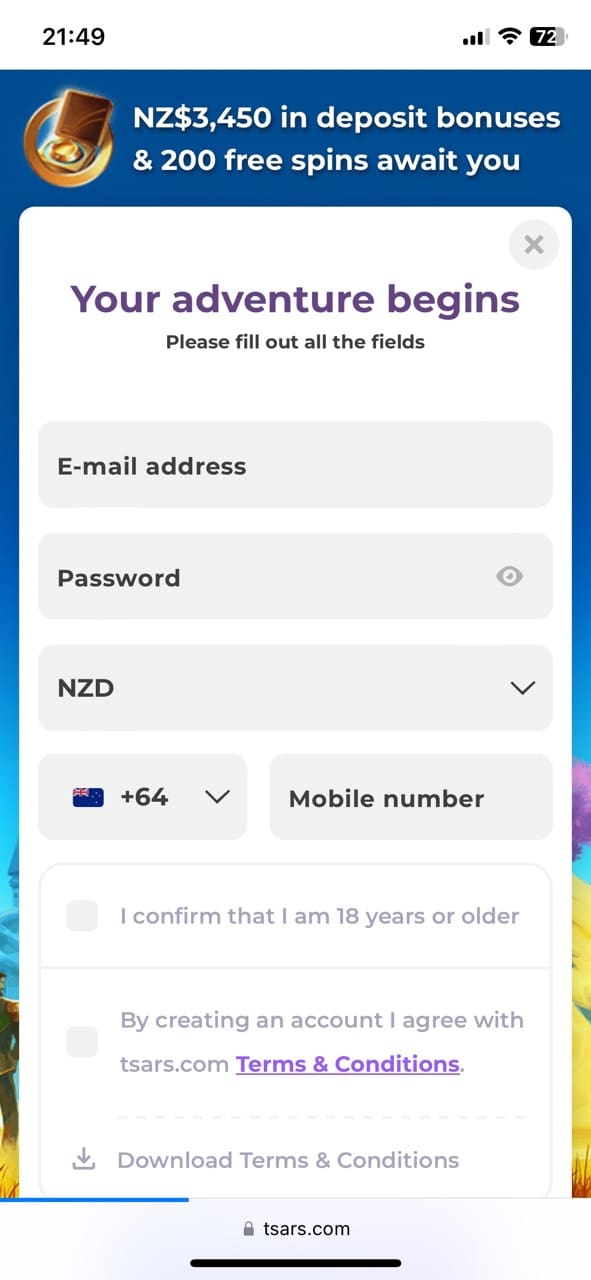 Registration at Tsars Online Casino NZ