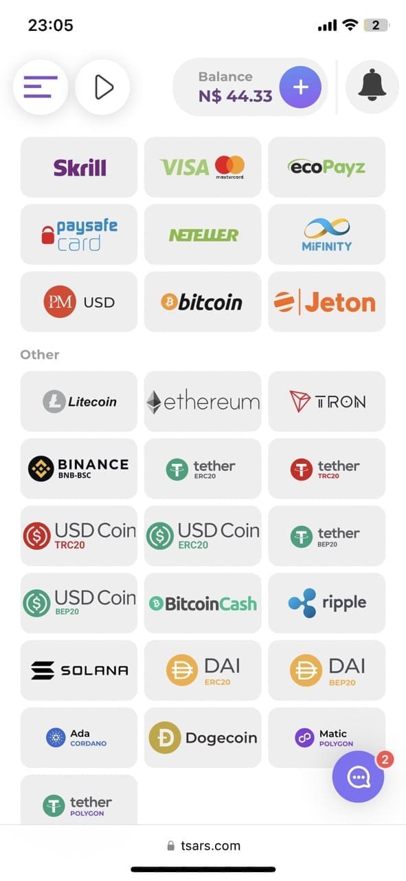 Tsars accepts a wide range of payment methods, starting from traditional bank cards and e-wallets to modern digital currencies that apply no fees and allow you to send and receive your assets immediately.